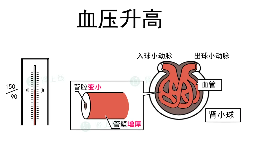 高血压和肾病互为恶性轮回,慢性肾病本人会导致血压升高,而血压升高后又反过来毁伤肾脏血管,导致肾小球内的血管管腔短促,出现缺血性的肾小球硬化。