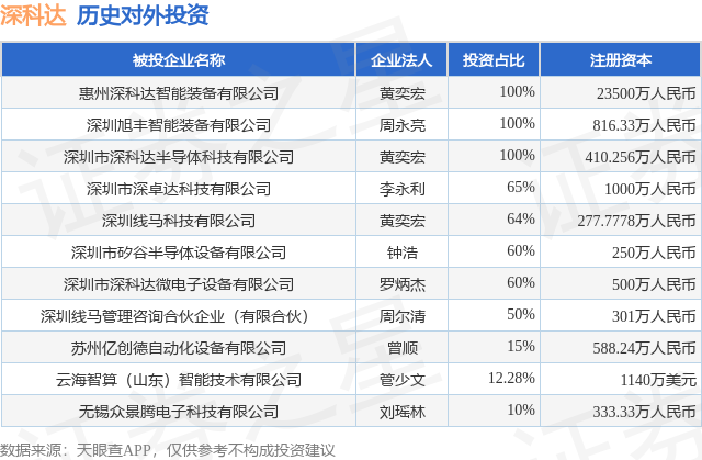 本站音书,笔据天眼查APP闪现,深科达(688328.SH)新增系数对外投资事件,被投资公司为云海智算(山东)智能本领有限公司,法定代表东说念诈欺少文,投资占比为12.28%。该公司从事狡计机、通讯和其他电子成就制造业,注册成本为1140万好意思元。当今,深科达共存在对外投资11项,详见下表: 通过天眼查大数据分析,深圳市深科达智能装备股份有限公司共对外投资了10家企业,参与招投标面目176次;财产陈迹方面有商标信息24条,专利信息366条,文章权信息53条;此外企业还领有行政许可21个。据2